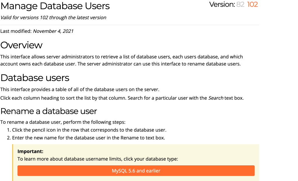 I created this document in version 82 of cPanel&WHM. The Manage Database Users interface helps users administrate their user accounts.