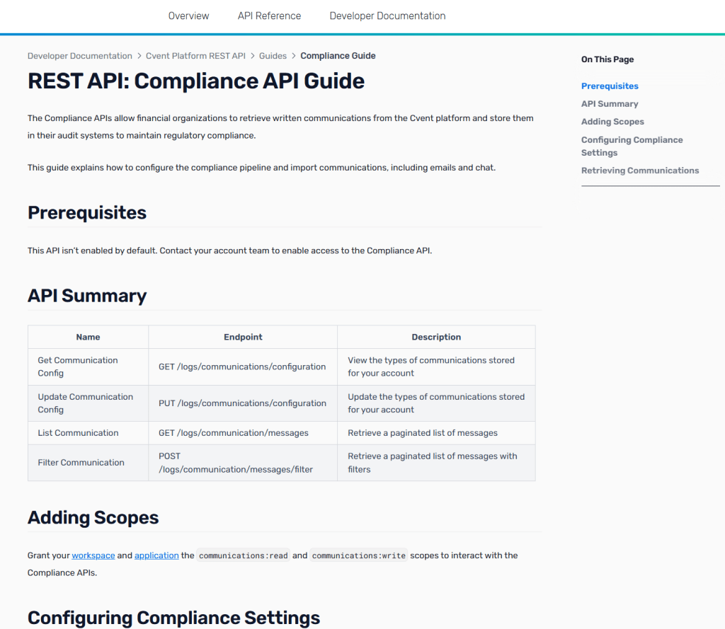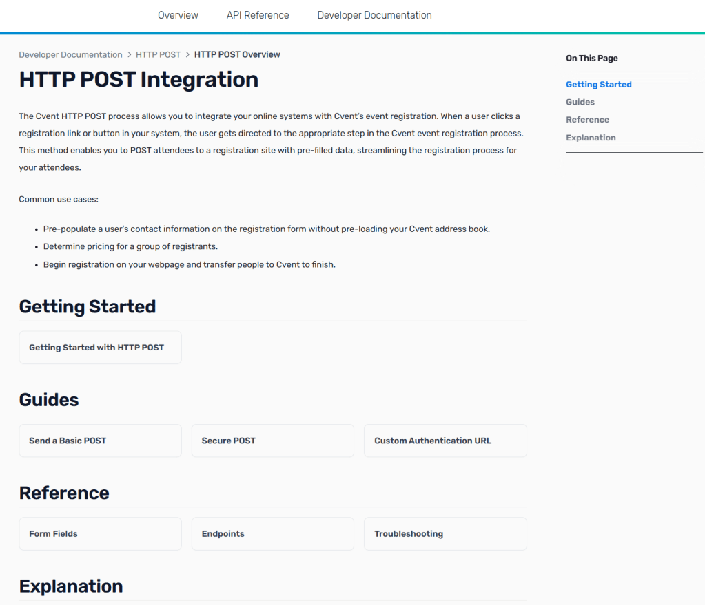 Currently, I collaborate with platform stakeholders to update and improve the Cvent developer portal website among other responsibilities. Additionally, I migrated the original site over from a simple WordPress and added structure via the Diátaxis Framework. Previously, various internal developers maintained the site with no consistent style or tone.