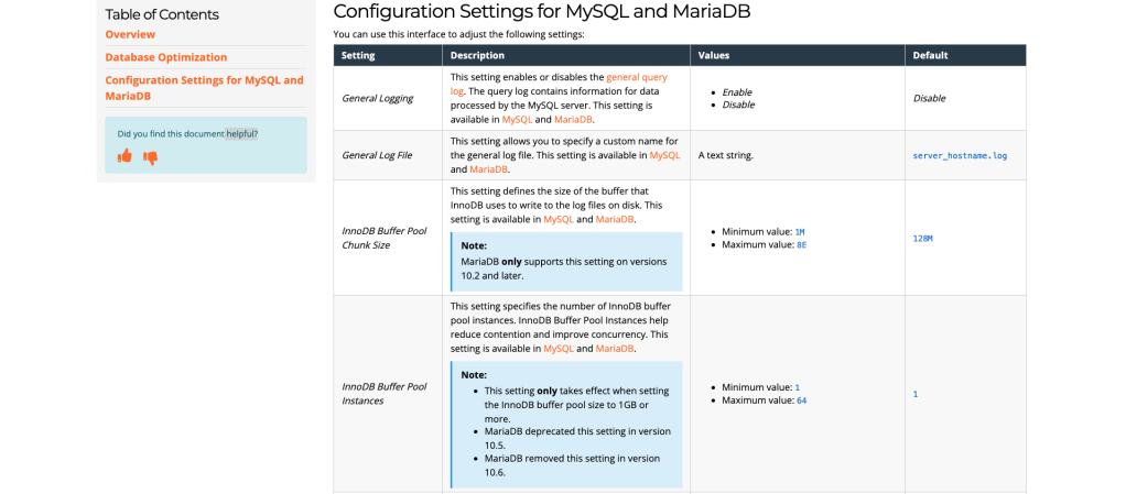 This interface consists of many toggleable options users can use to configure their MySQL or MariaDB deployment. I worked with SMEs to define each setting and supply the user with links to helpful third-party documentation where needed.