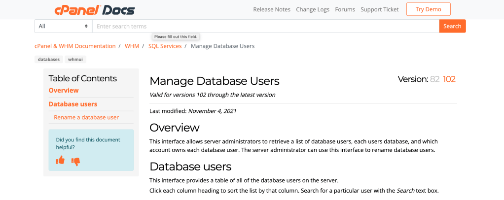 I created this document in version 82 of cPanel&WHM. The Manage Database Users interface helps users administrate their user accounts.