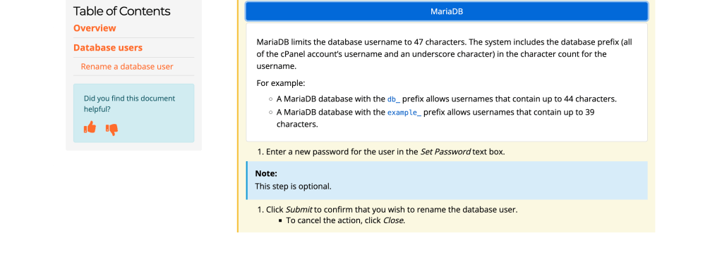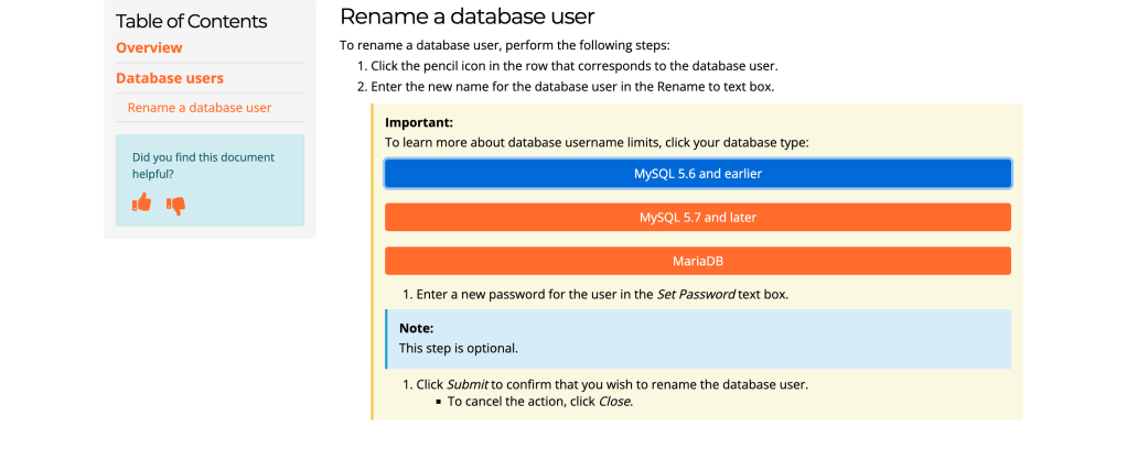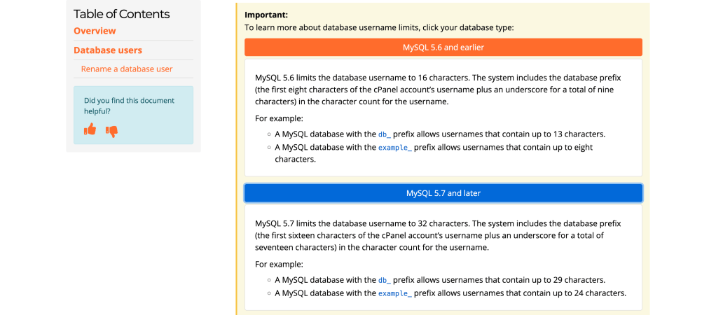 This interface is simple to use, but users can run into problems regarding the character limits on their database users. I created multiple dropdown menus with examples to help users understand the database naming limitations for MySQL and MariaDB.